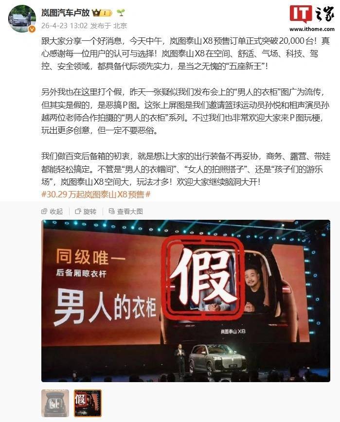 随后,卢放也对网传的发布会“男人的衣柜”图进行了辟谣。他称这张图其实是假的,是恶搞 P 图。这张上屏图是岚图汽车邀请篮球运动员孙悦和相声演员孙越合作拍摄的“男人的衣柜”系列。
