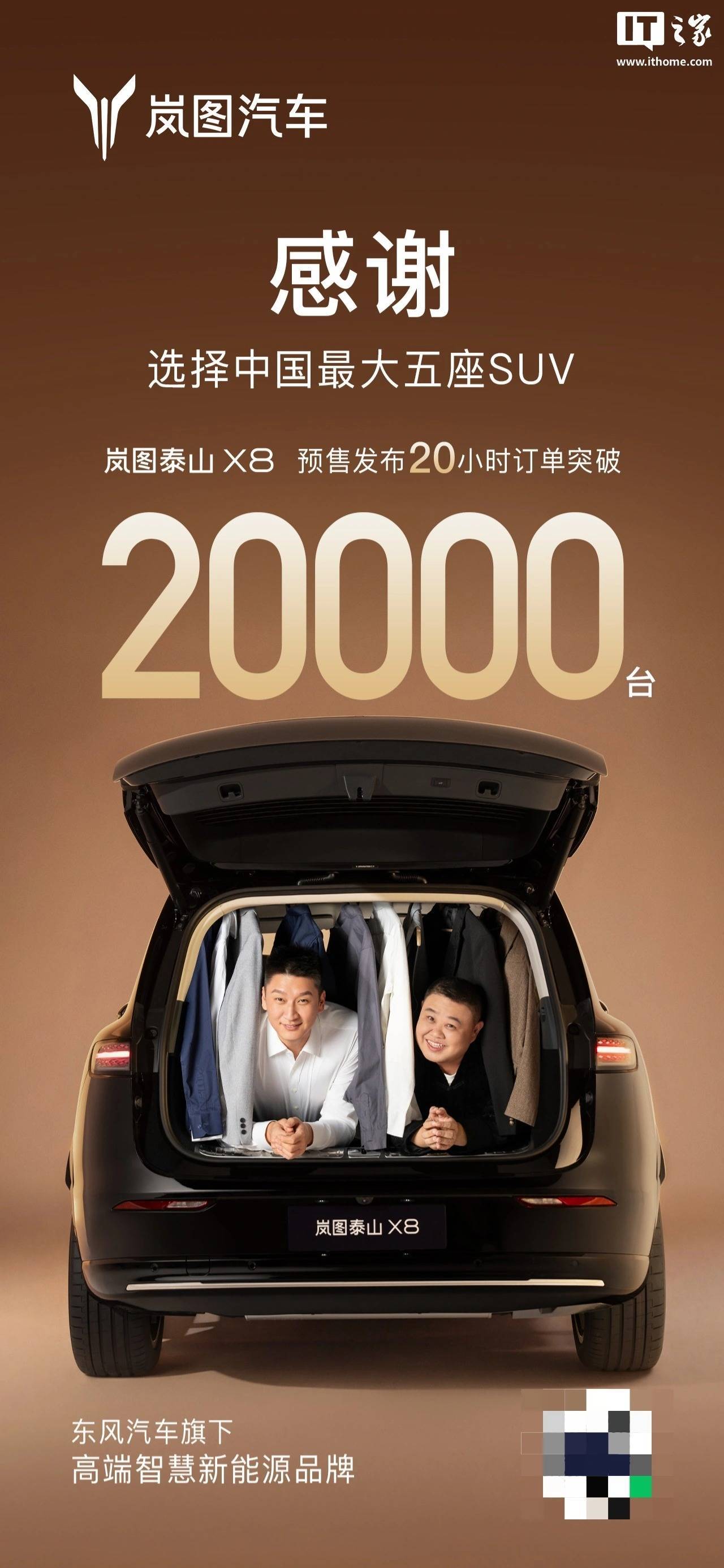 4 月 23 日消息,岚图汽车科技股份有限公司董事长卢放刚刚宣布,今天中午,岚图泰山 X8 预售订单正式突破 2 万台。